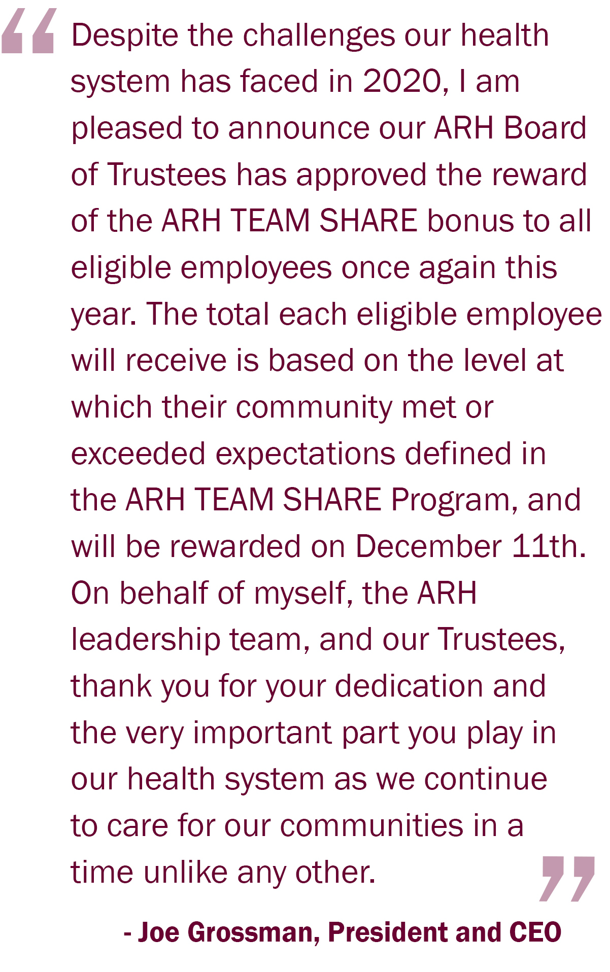 TEAM SHARE was enacted to bring about a consistent level of excellence throughout our System and specifically targeted ARH’s quality, patient satisfaction and financial performance. As part of TEAM SHARE, ARH employees have the opportunity to earn a bonus for achieving operational excellence if the ARH System and Communities have met their quality, service and financial goals. The bonus is based on the cumulative achievement of quality (40%), patient satisfaction (40%), and financial performance (20%) per quarter during the fiscal year.